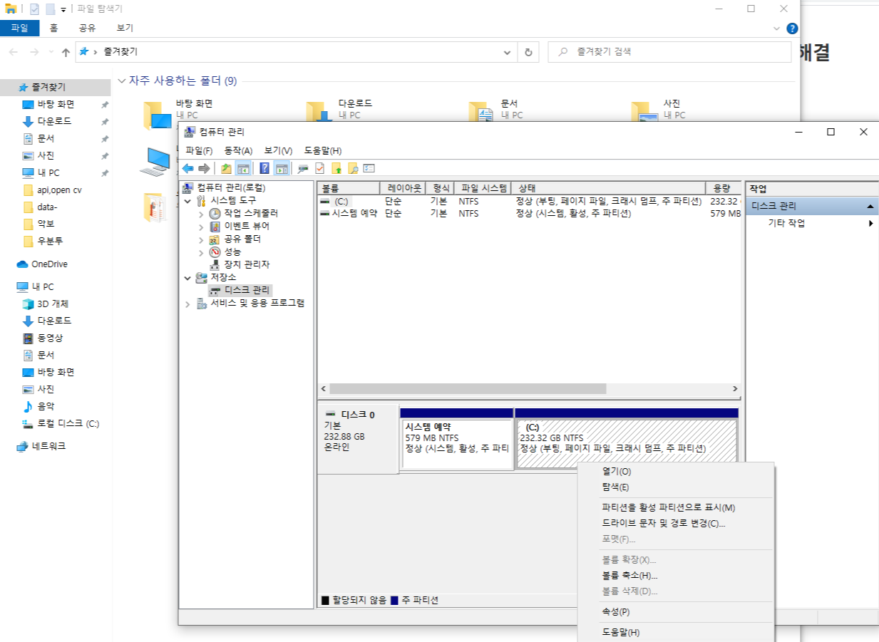 파일탐색기 열어서 내 PC 오른쪽클릭 , 관리메뉴 클릭