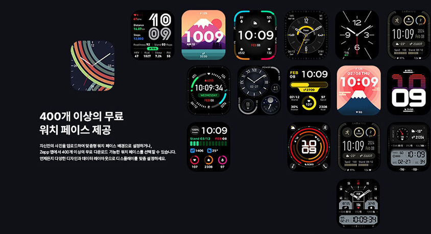 - Zepp Flow 음성 제어를 통한 음성 명령 지원—기기 조작, 운동 시작, 알림 확인 등에 유용