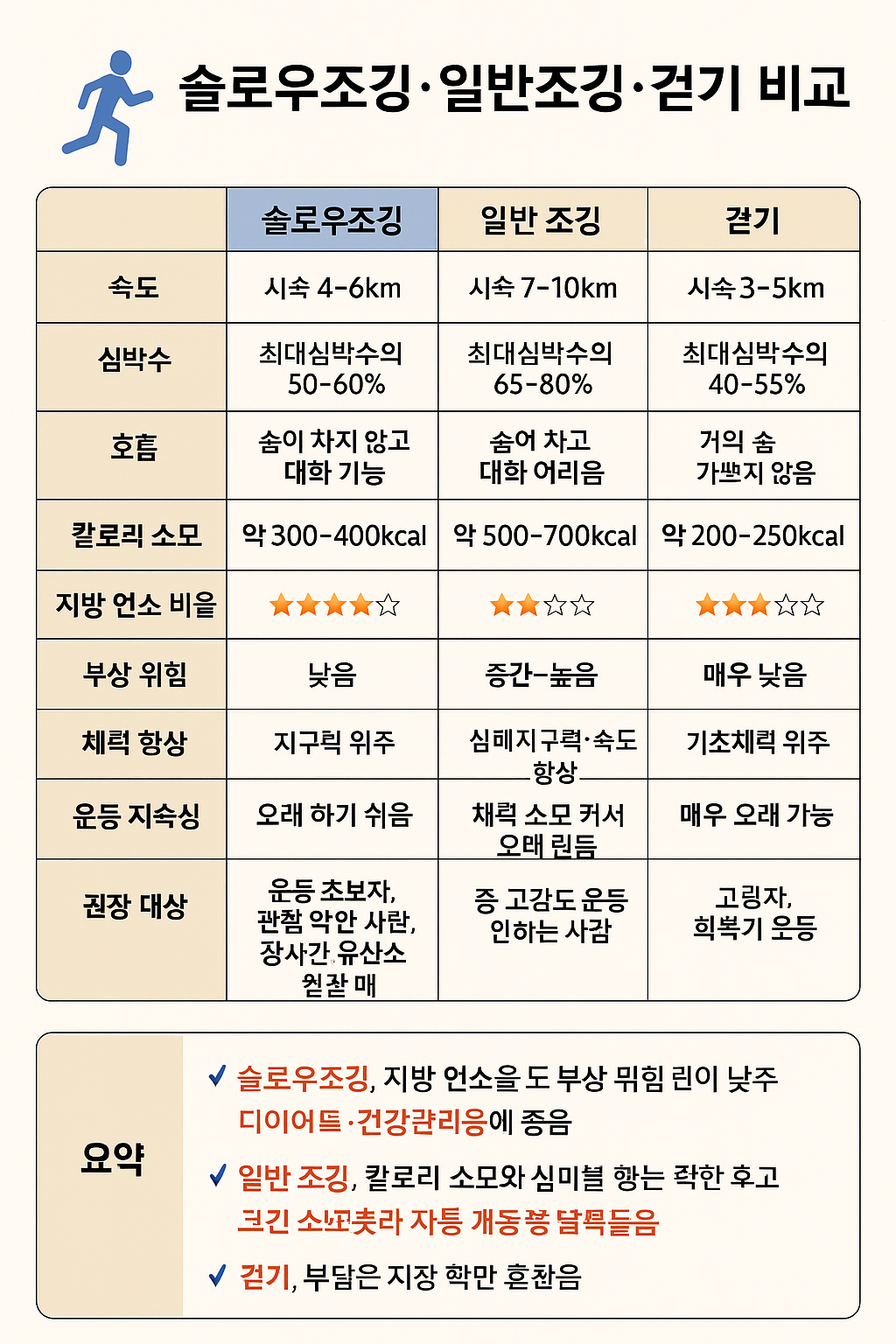 - 슬로우조깅 → “지방 연소 + 부담 적은 장시간 운동”에 최적
