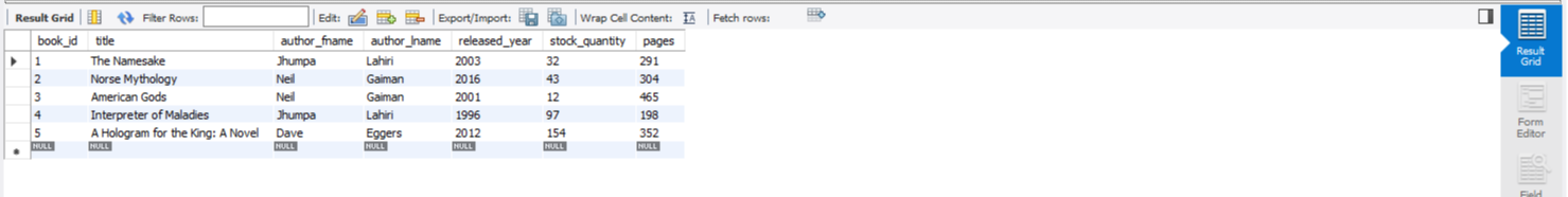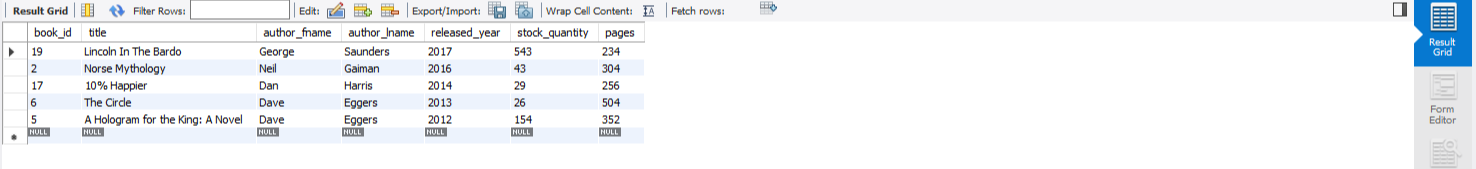 위는, books테이블에서 첫 행부터 다섯개의 행까지 모든 컬럼 데이터를 가져오겠다는 뜻이다.