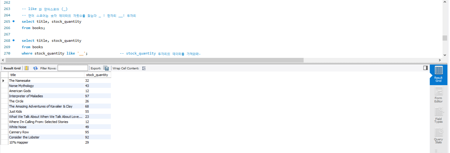 위는 stock_quantity 의 데이터가 두자리인 데이터의 title, stock_quantity 컬럼을 조회한것이다.