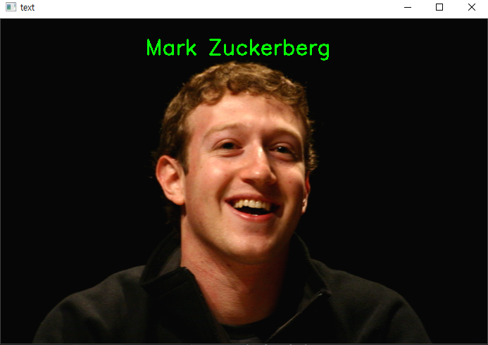 cv2.putText(imageText, 'Mark Zuckerberg', (205,50), cv2.FONT_HERSHEY_SIMPLEX, 1, (0,255,0),2 )
